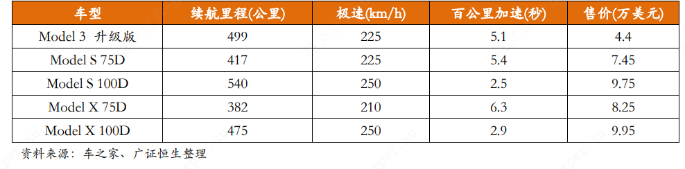 Model 3在市场上广受欢迎,成为美国中低端乘用车销售量的第5位。2016年3月,特斯拉发布首款低端车型Model 3,展示前已收到超过10万的预订订单,受到行业普遍好评。作为一款面向大众市场的车型,Model 3关注续航里程、最高时速和百公里加速时间三大核心指标。尽管设计较为简约,但在这三项指标的综合比较中,Model 3的性价比最高,符合大众客户需求。特斯拉最终实现了创始初衷,生产价格亲民的电动轿车。