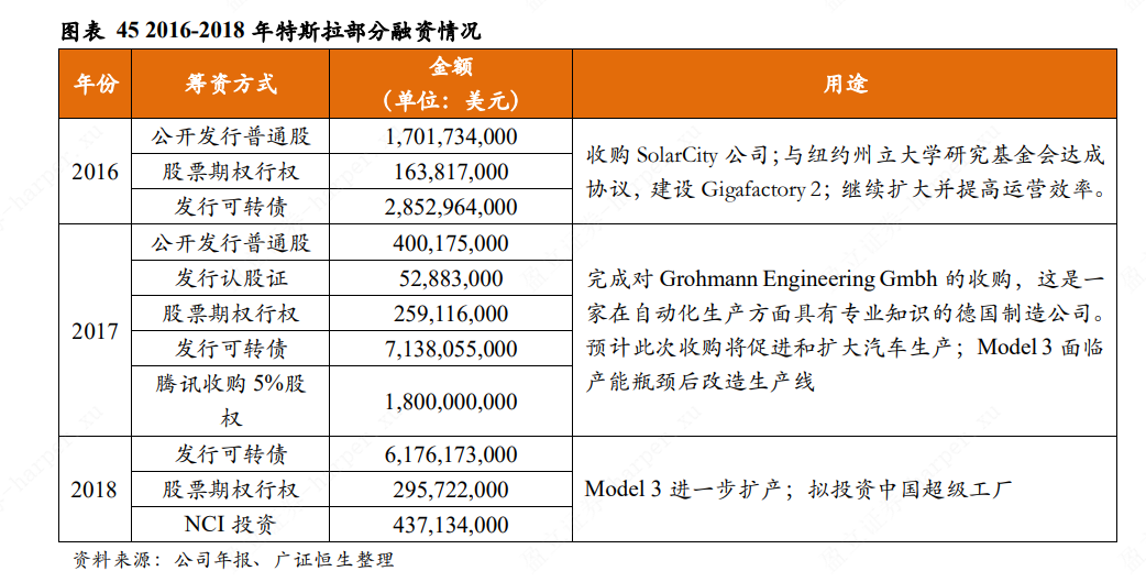 2016 至 2017 年特 斯拉融资金额明显飙升,为 2017 至 2018 年大规模量产 Model 3 提前做好资金准备。融资结构方面,主要 仍是以债务融资为主。