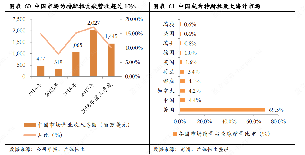 2017 年特斯拉汽车在中国的销量在 1.5 万辆左右,市场份额还不到 3%,这使得特斯拉在中国市场有着巨大的增长空间。自 2014 年以来,中国市场为特斯拉贡献超过 10%的收入额。与 此同时,2018 年中国成为特斯拉除了美国本土市场以外的最大海外市场,前三季度占全球销量的 4.4%。因而特斯拉全球化战略第一步落在了中国明智的选择。