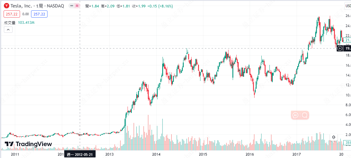 2010-2017年Tesla股价变动图